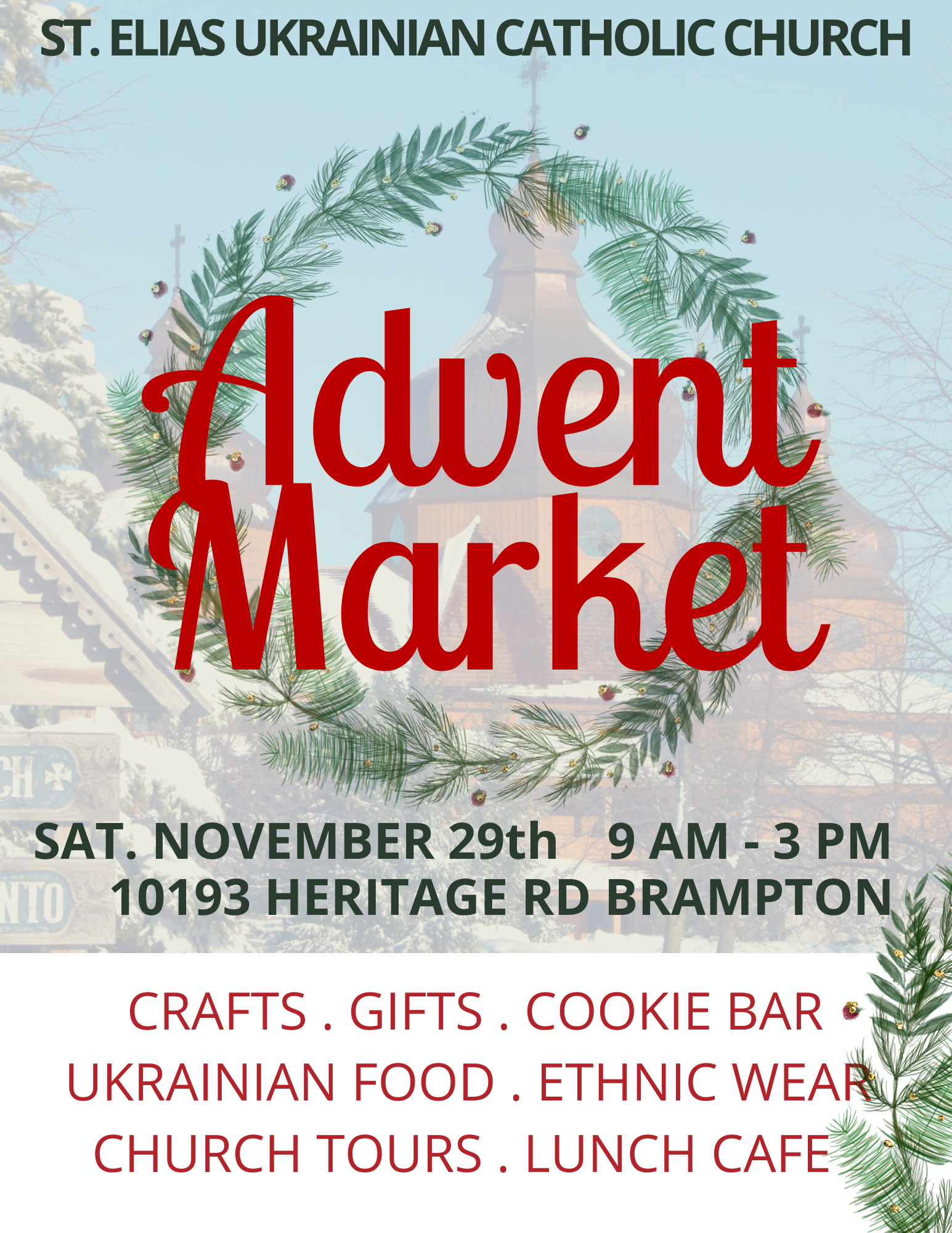 Join us for our ADVENT MARKET at St. Elias Ukrainian Catholic Church on SATURDAY NOVEMBER 29th 9am-3pm. Bring your family and friends and support our parish annual fundraiser.